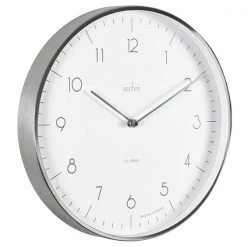 The Acctim Aldington Wall Clock in Natural features a wood effect background, mirror dial with frosted print numbers and a spun metal centre disc with metal pendulum and quartz movement. Dimensions: 50cm x 20cm x 5cm.