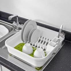 The Addis draining station is multifunctional for draining a variety of items. The large space has a soft base so delicate items like glasses ill not be damaged. The draininer includes a rack for plates and a small section for draining cutlery and utensils. The draining station is finished in green and white and features soft touch feet to protect your work surfaces.
