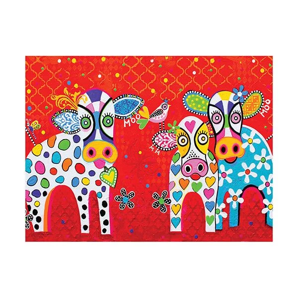 The Maxwell & William Pete Cromer happy moo day tea towel features the lovely image of a group of cows in a colourful and bold print style.