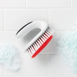 This OXO Good Grips Orange All-Purpose Scrub Brush has stiff outer bristles for tough spots and soft inner bristles that leave surfaces aglow. The contoured handle keeps knuckles from rubbing up against surfaces, and has a soft, comfortable, non-slip grip to cushion hand while scrubbing. Tackles tough grime, yet soft enough for sparkling detail. Dimensions 12.7cm x 7.62cm x 10.1cm.