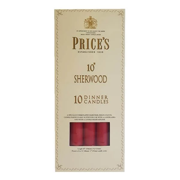 Candle Height : 250 mm Candle Diameter : 22 mm Burn Time : 9 hours. The Sherwood dinner candle was designed and created by Price’s in the 1830’s. It was selected by Princess Victoria for her wedding to Prince Albert in 1840 and is still used by the British Royal Household for State occasions. Prices 10″ Sherwood Candles are available in various colours as a pack of 10.