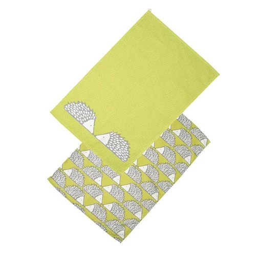 Two soft green cotton Tea Towels featuring Spike the Hedgehog.