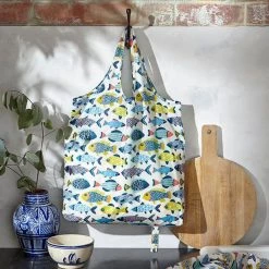 The Ulster Weavers Aquarium packable bag is perfect for popping in a pocket, car or handbag. Designed to fold into a small parcel held together with a popper, convenient for spontaneous shopping trips and saving on using plastic bags. The colourful Aquarium is inspired by deckchairs and beach towels, memories of seaside holidays, combined with a nautical palette.